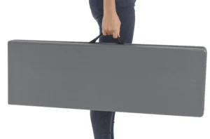 Opis: Klupa Sharpbench180 ZOWN je dizajnirana za profesionalnu upotrebu na raznim događajima u zatvorenom i otvorenom prostoru. Sa svojom dužinom od 184 cm i širinom od 30,5 cm omogućava udobno sedenje za 3 osobe. Sedište je preklopivo na pola, što olakšava transport i skladištenje, jer se klupa sklapa kao kofer sa ugrađenom ručkom za lako nošenje. Automatski klizni prsten omogućava sigurno i jednostavno zaključavanje nogu u otvorenom položaju.Materijal: Sedište je napravljeno od 100 % čistog visokorestorativnog polietilena (HDPE), što garantuje izdržljivost i otpornost na vremenske uticaje. Konstrukcija je izrađena od čelika obojenog prahom, što povećava otpornost na habanje i koroziju.Sertifikati: